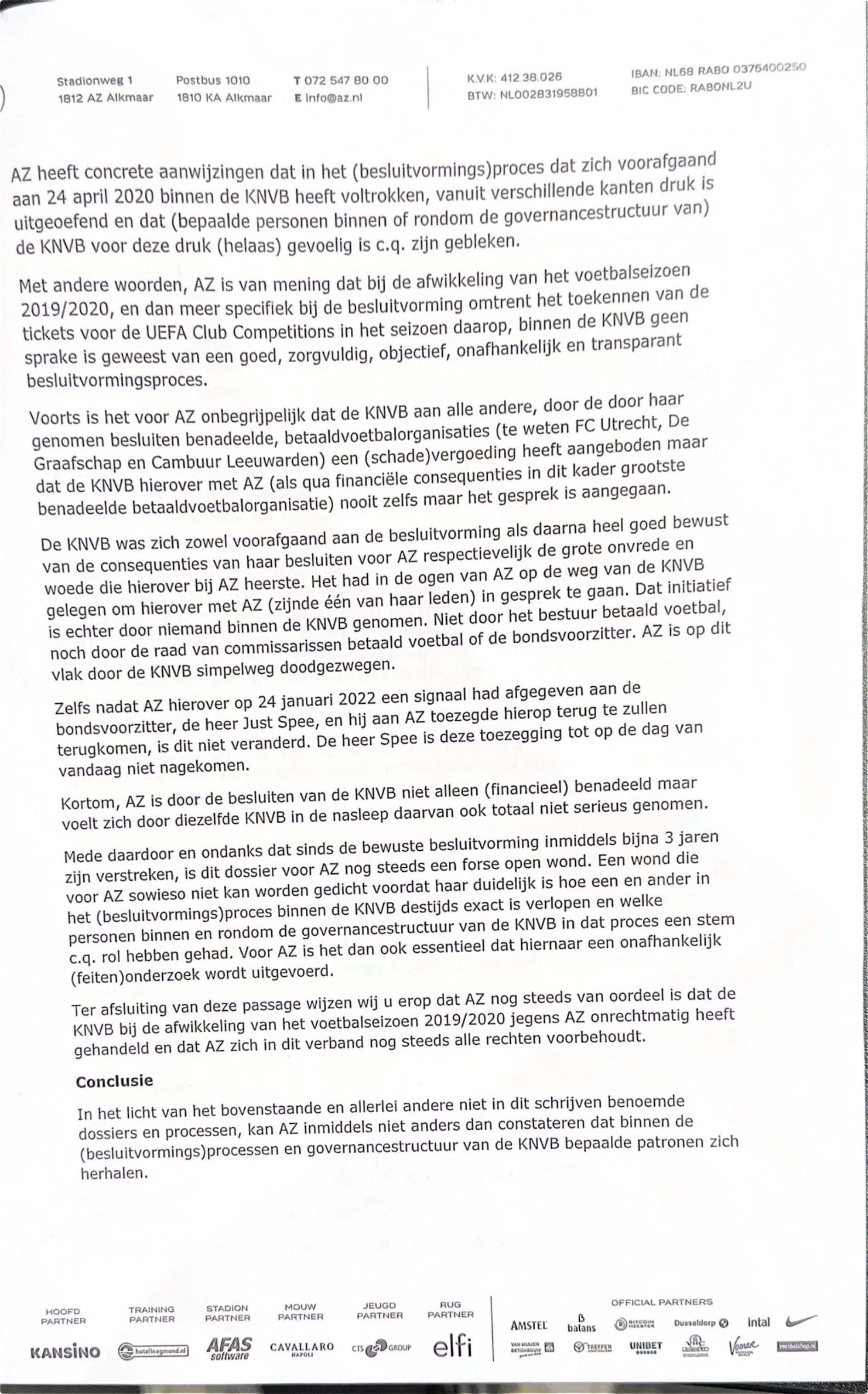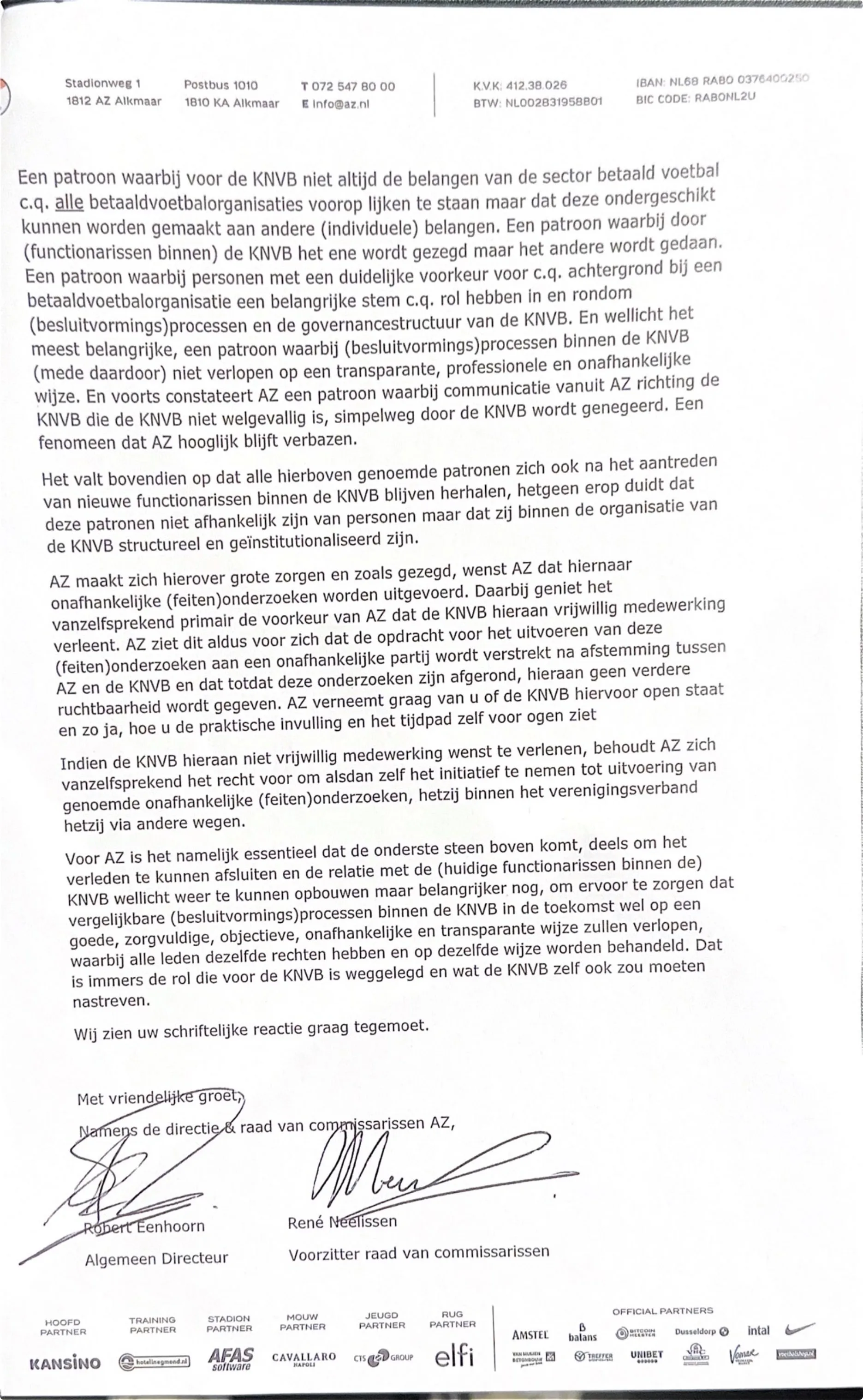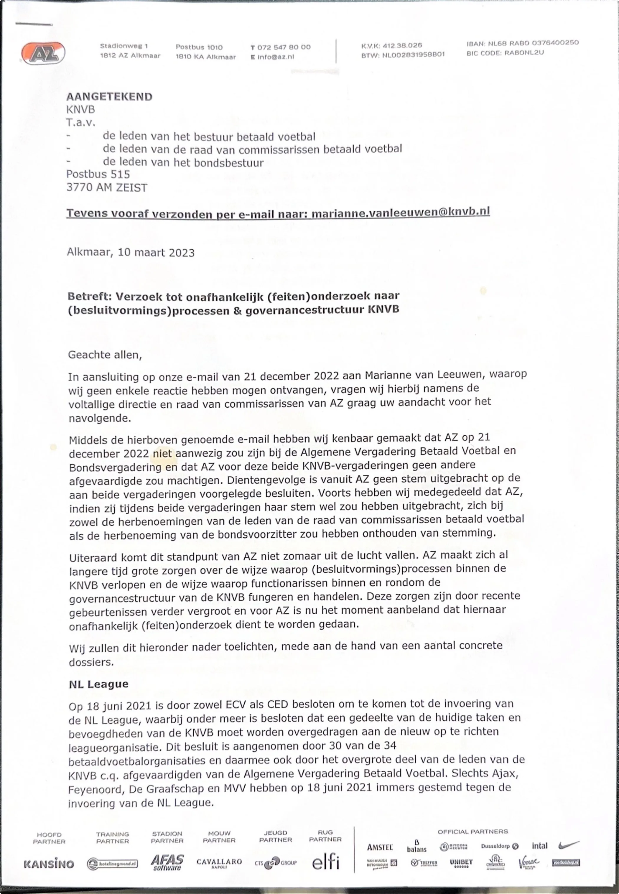 AZ opent de aanval op de KNVB. Dat blijkt uit een brief die in handen is gekomen van sportmarketeer Chris Woerts, zie hieronder.