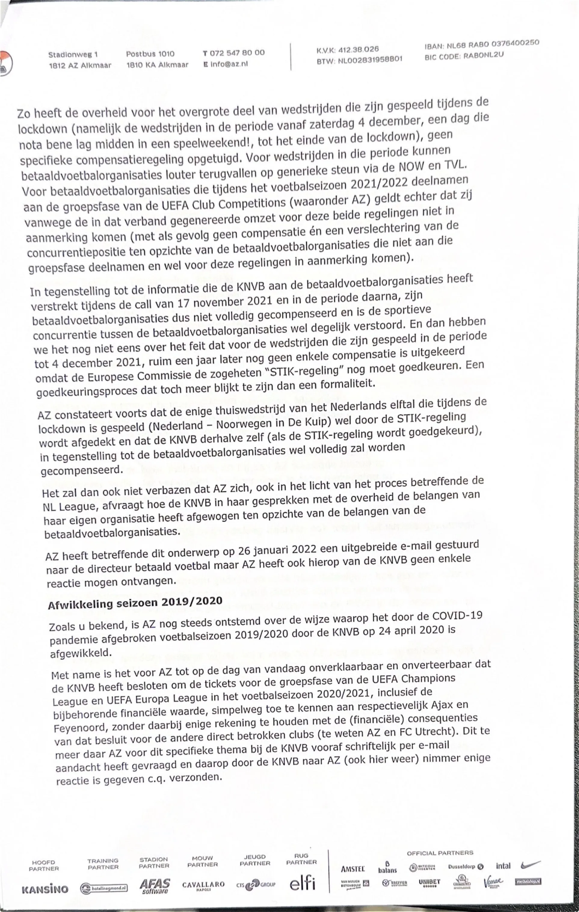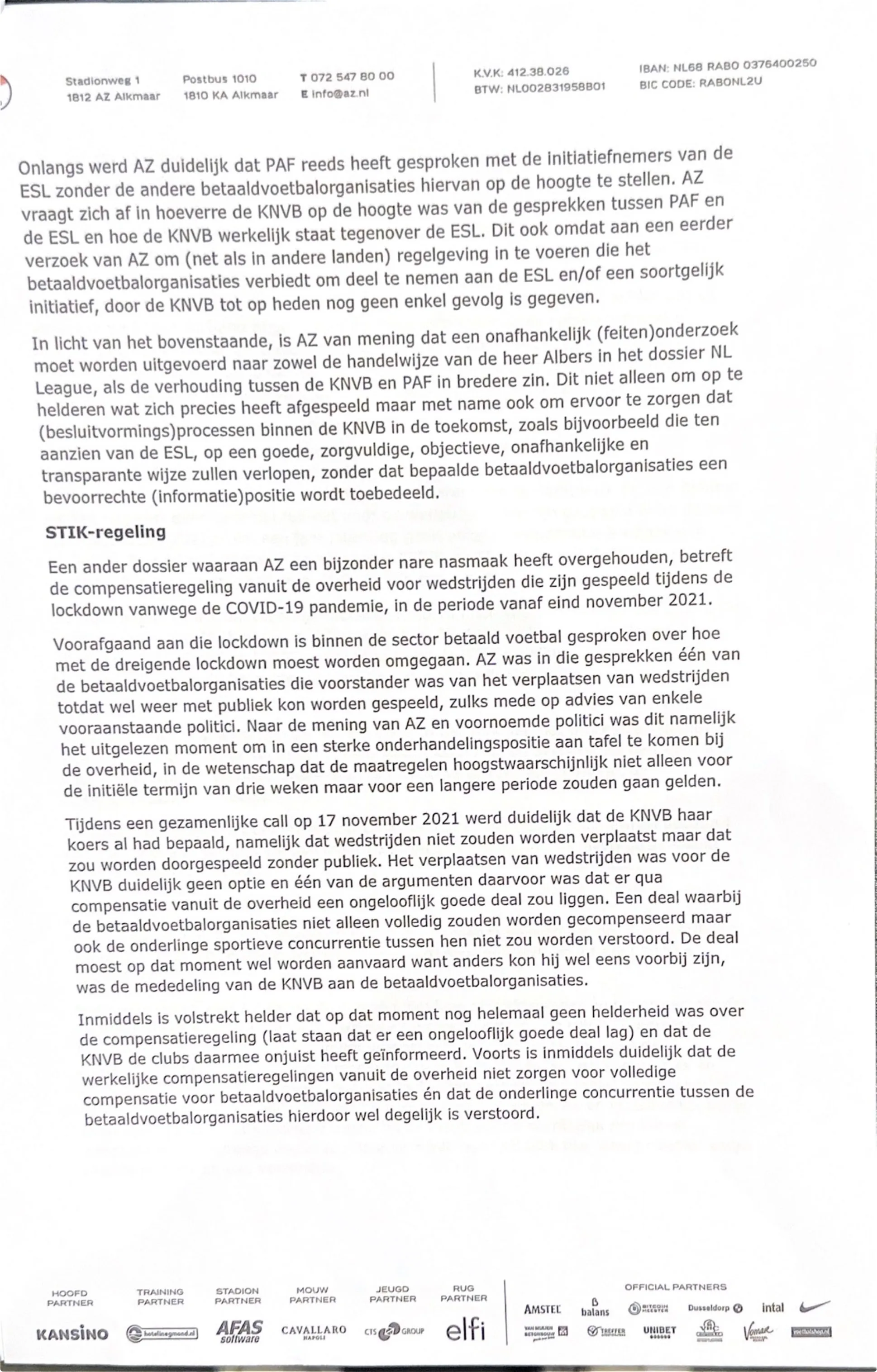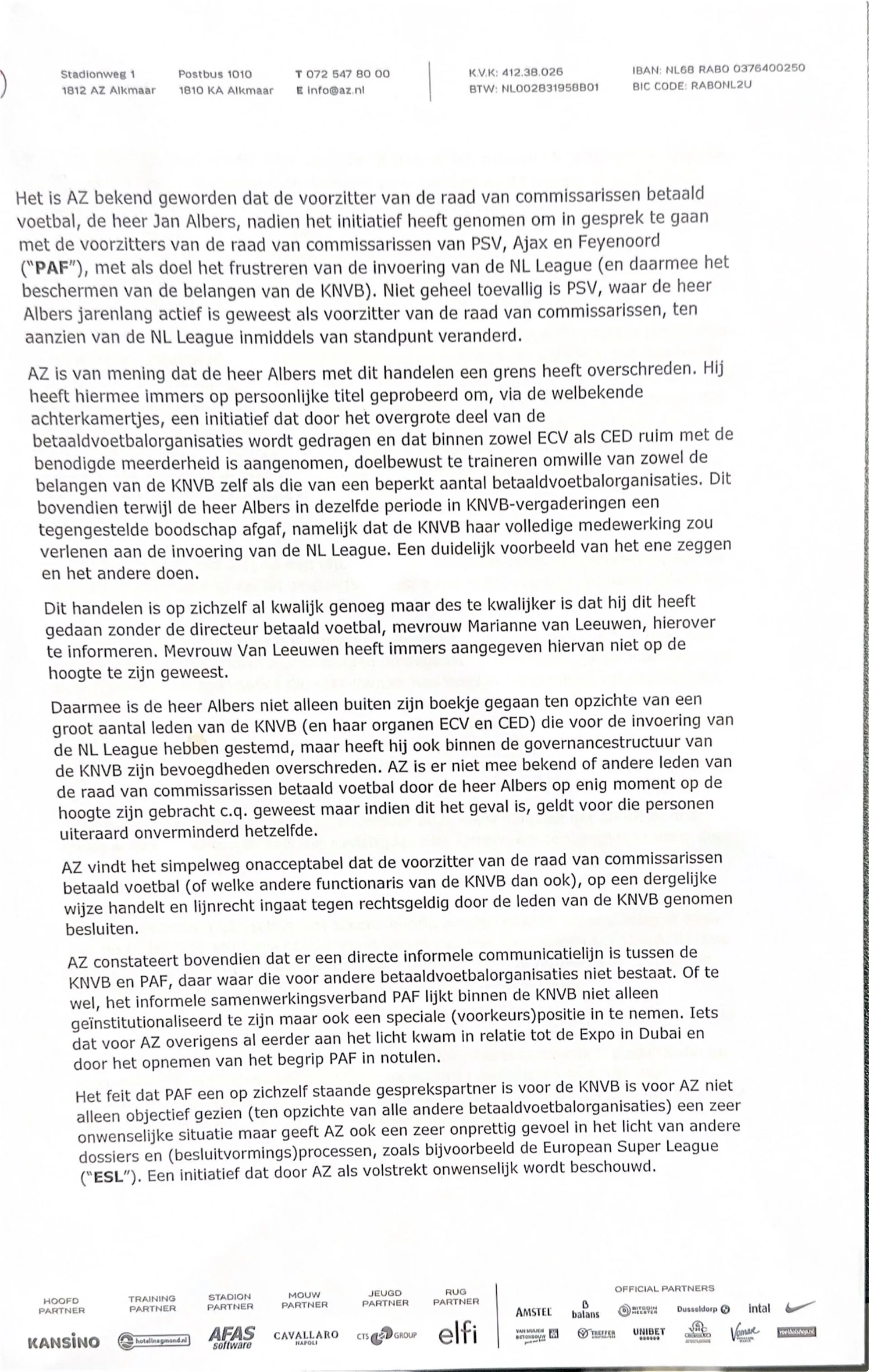 AZ opent de aanval op de KNVB. Dat blijkt uit een brief die in handen is gekomen van sportmarketeer Chris Woerts, zie hieronder.