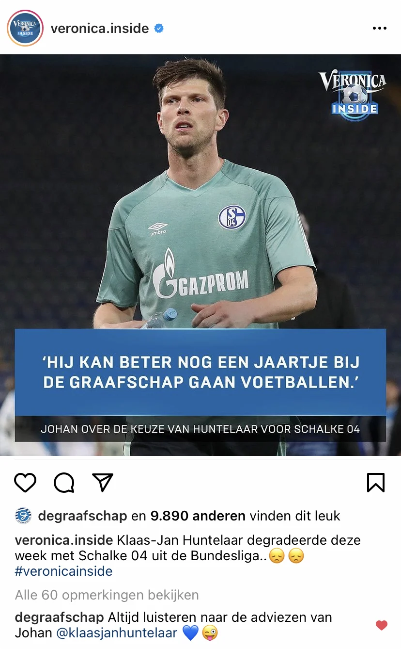 Schalke 04 degradeerde afgelopen week officieel naar de 2e Bundesliga. Johan is van mening dat als Klaas-Jan Huntelaar nog graag een jaar wil blijven voetballen, hij dat beter bij De Graafschap kan doen dan bij Schalke, zo vertelde hij afgelopen vrijdag in Veronica Inside. De Graafschap kan zich wel vinden in die woorden, zo laat de club weten op Instagram.