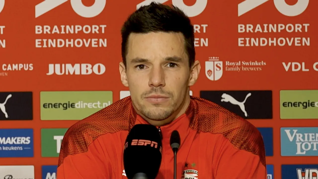 Nick Viergever op de persconferentie na afloop van PSV-Vitesse (3-1).