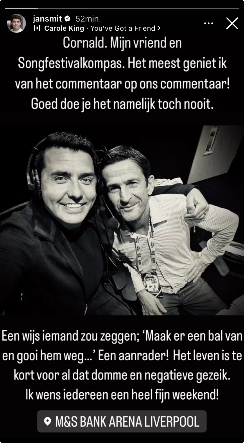Bij een foto van Cornald Maas en hemzelf schrijft Jan Smit: "Cornald. Mijn goede vriend en Songfestivalkompas. Het meest geniet ik van het commentaar op ons commentaar! Goed doe je het namelijk toch nooit."