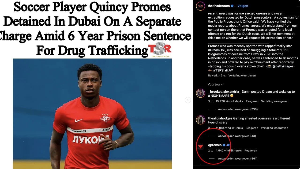Quincy Promes heeft via Instagram op het nieuws gereageerd dat hij vast zou zitten in Dubai. Volgens Russische media is de aanvaller betrokken geweest bij een ongeval en zou hij daarna zijn gevlucht.