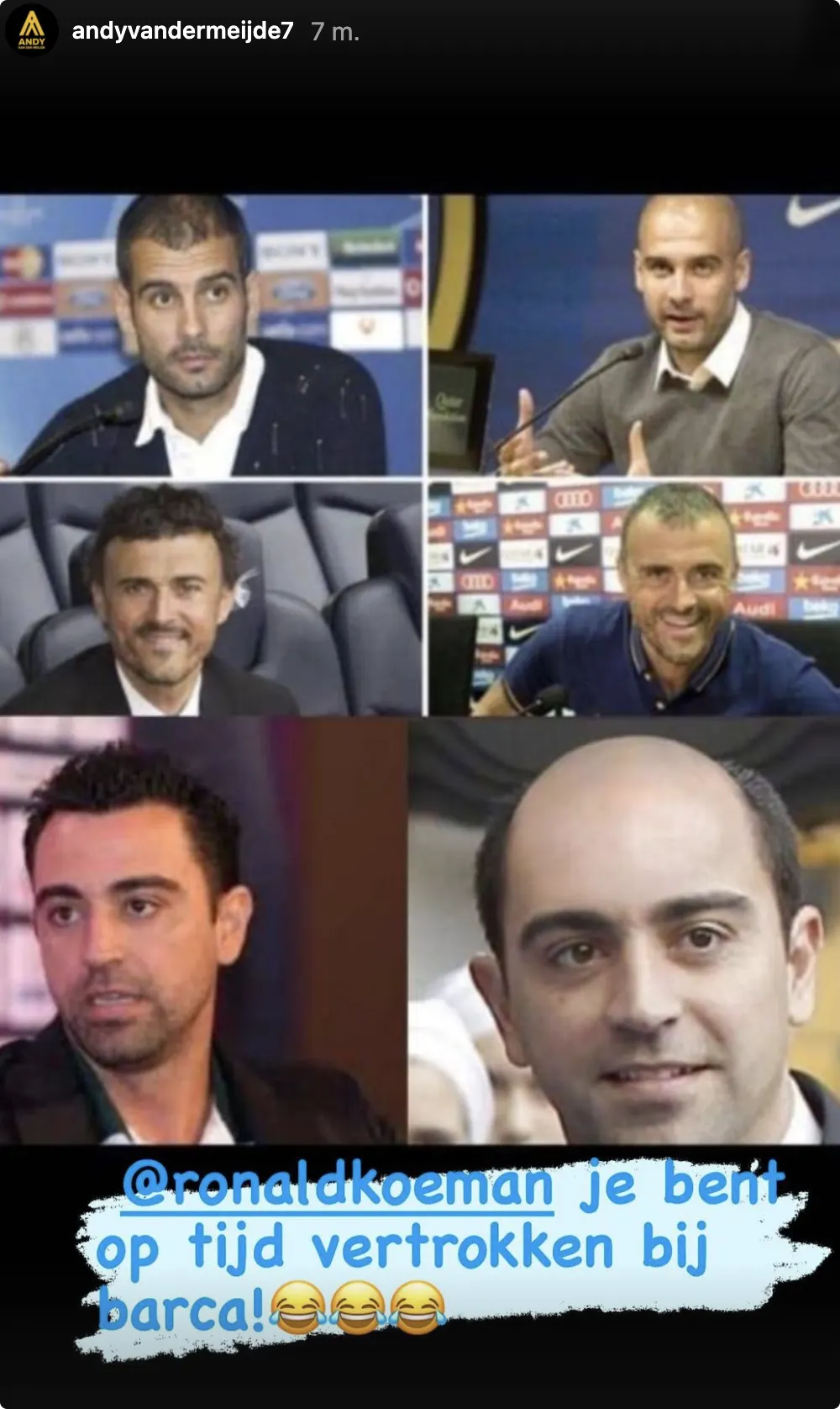 Andy van der Meijde heeft de lachers weer eens op zijn hand gekregen. De oud-voetballer stelt dat Ronald Koeman blij moet zijn met zijn vertrek bij FC Barcelona en dat zijn opvolger Xavi moet vrezen voor zijn kapsel.