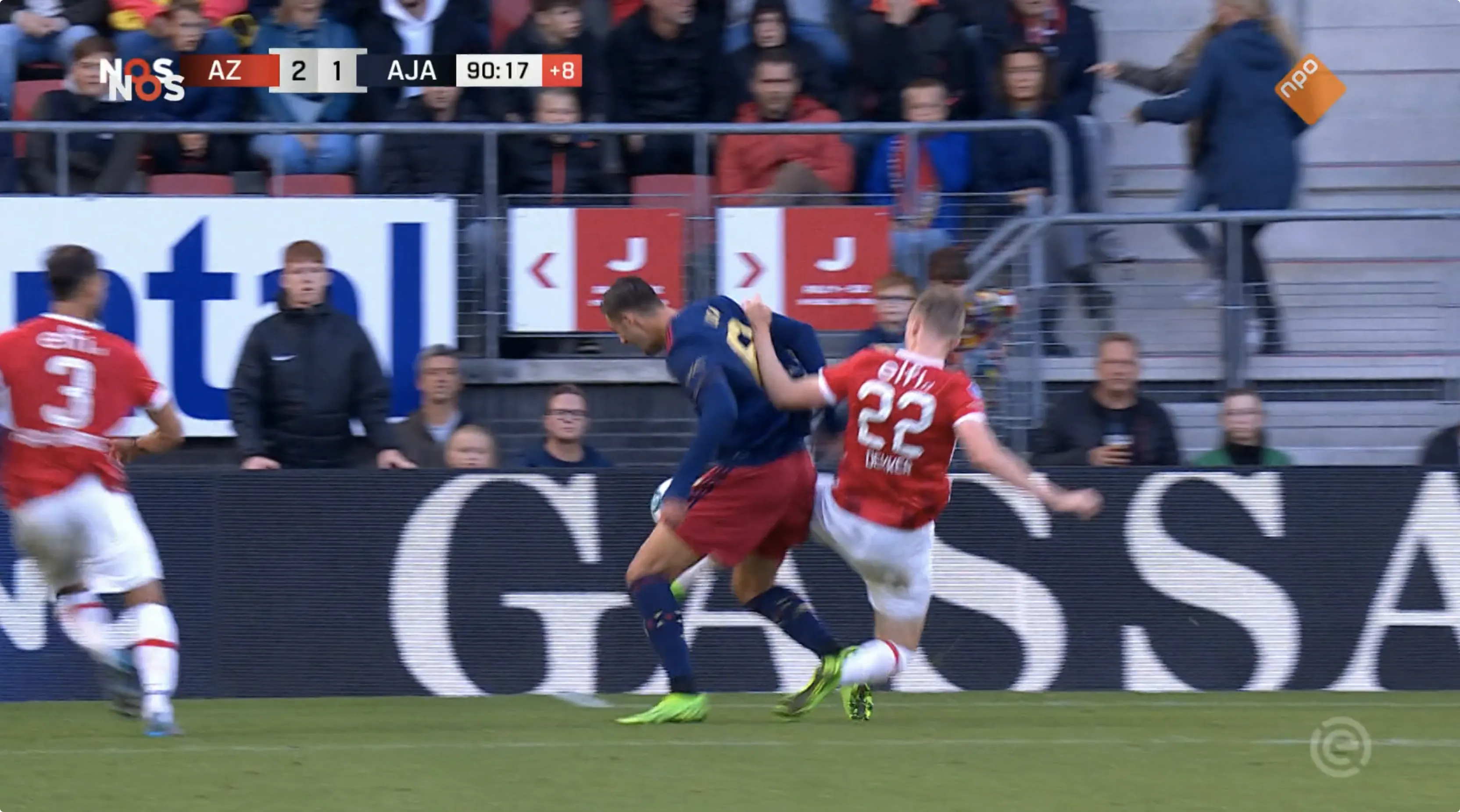 Pierre van Hooijdonk is van mening dat Ajax zondag in de slotfase van het duel met AZ een penalty onthouden is. De analist zag Ajax-invaller Lorenzo Luca onderuit gaan in het strafschopgebied na een tackle van AZ-verdediger Maxim Dekker.