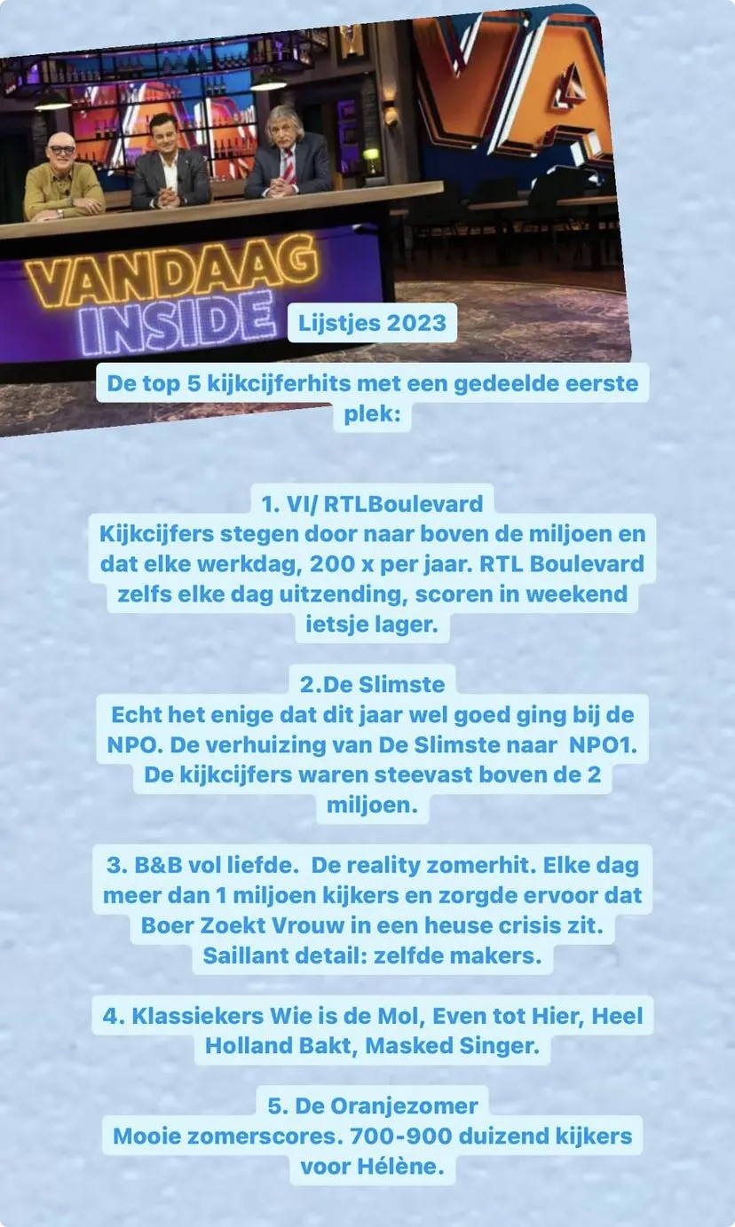 Vandaag Inside én De Oranjezomer staan in de Top 5 van kijkcijferhits van Tina Nijkamp. De kijkcijferexpert deelde haar Top 5 op Instagram.