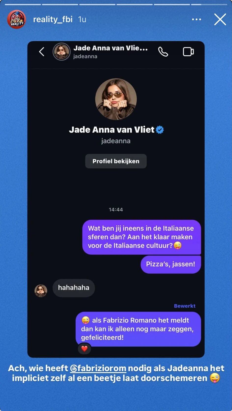 Reality_fbi vraagt vervolgens via een dm aan Jade Anna: "Wat ben jij ineens in de Italiaanse sferen dan? Aan het klaarmaken voor de Italiaanse cultuur?" De influencer reageert: "Hahahaha." Het juicekanaal gaat verder: "Als Fabrizio Romano het meldt, dan kan ik alleen nog maar zeggen: gefeliciteerd!" Daarop reageert Jade Anna met een like.