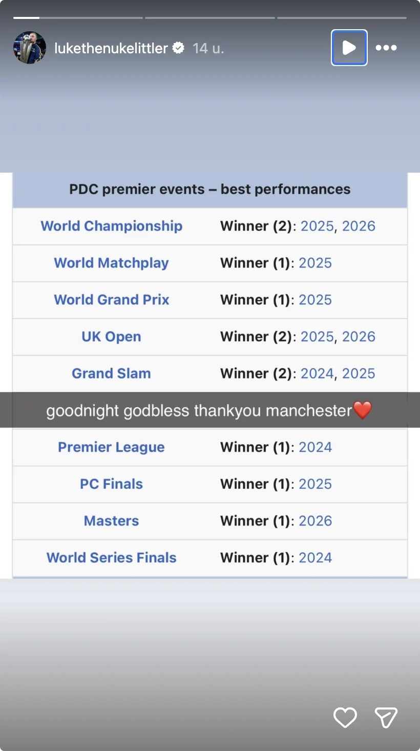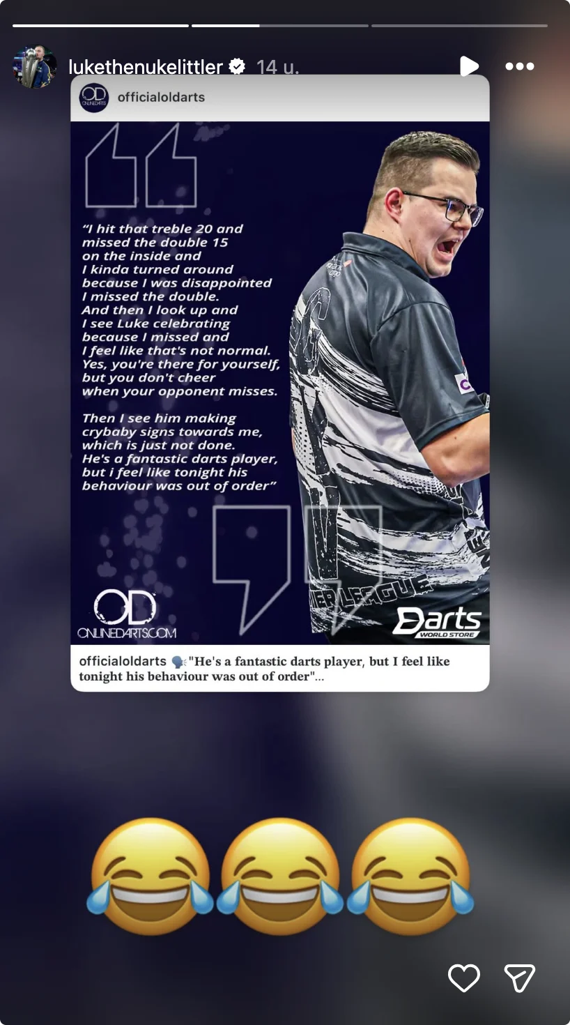 De spanning is volledig geëscaleerd tussen Luke Littler en Gian van Veen na een verhitte Premier League-avond in Manchester. Littler, die de nederlaag in ‘zijn’ Manchester duidelijk niet kon accepteren, zocht na afloop van de wedstrijd de confrontatie op via Instagram.