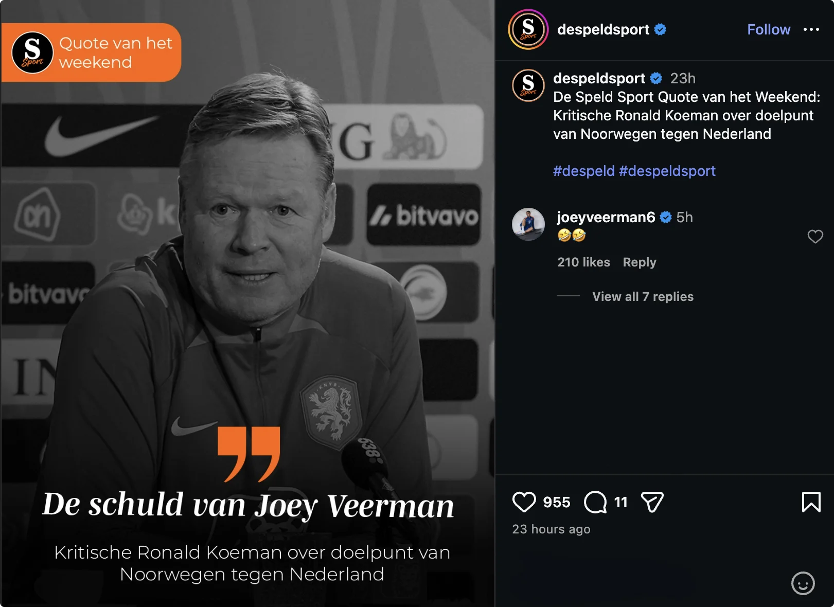 Het Nederlands Elftal speelde afgelopen vrijdag een oefeninterland tegen Noorwegen, waarin met 2-1 werd gewonnen. Het satirische platform De Speld Sport plaatste op Instagram een post, waarin een nepquote van Koeman te lezen viel. De bondscoach zegt zogenaamd over de treffer van Noorwegen: "De schuld van Joey Veerman."