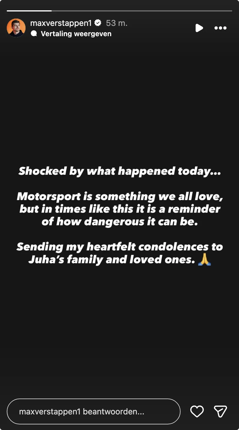 "Ik ben geschokt door wat er vandaag is gebeurd", schrijft Verstappen op Instagram. "We houden allemaal van motorsport, maar dit soort momenten herinneren je eraan hoe gevaarlijk het kan zijn. Mijn oprechte deelneming aan de familie en dierbaren van Juha."