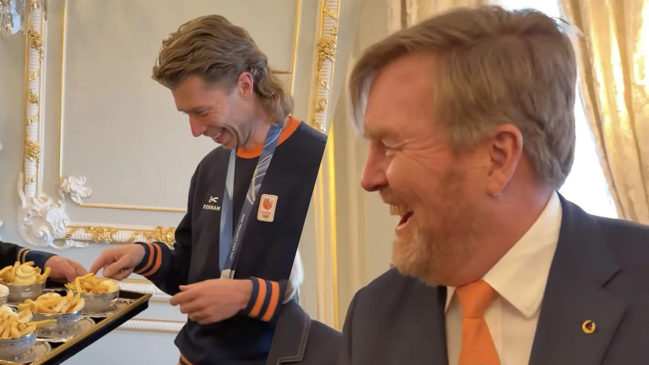 Koning Willem-Alexander heeft Jorrit Bergsma dinsdag tijdens de officiële ontvangst van de olympische medaillewinnaars op Paleis Noordeinde verrast met een "patatje mayo". Daarmee vervulde de vorst een wens van de schaatser. "Regelen we eventjes", lacht de koning in een filmpje dat TeamNL dinsdagavond online zette.