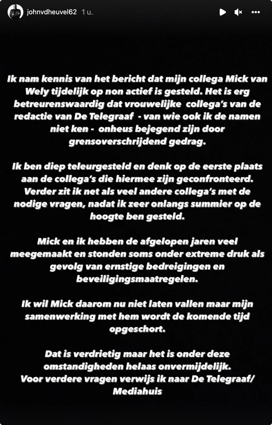 'Het is erg betreurenswaardig dat vrouwelijke collega's van de redactie van De Telegraaf - van wie ook ik de namen niet ken - onheus bejegend zijn door grensoverschrijdend gedrag. Ik ben diep teleurgesteld en denk op de eerste plaats aan de collega's die hiermee zijn geconfronteerd', schrijft Van den Heuvel op Instagram. 'Verder zit ik net als veel andere collega's met de nodige vragen, nadat ik zeer onlangs summier op de hoogte ben gesteld.'