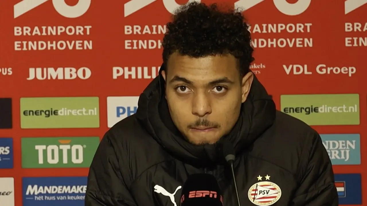 Donyell Malen reageert tijdens de persconferentie na aanloop van de wedstrijd PSV - FC Twente op vragen van de pers.